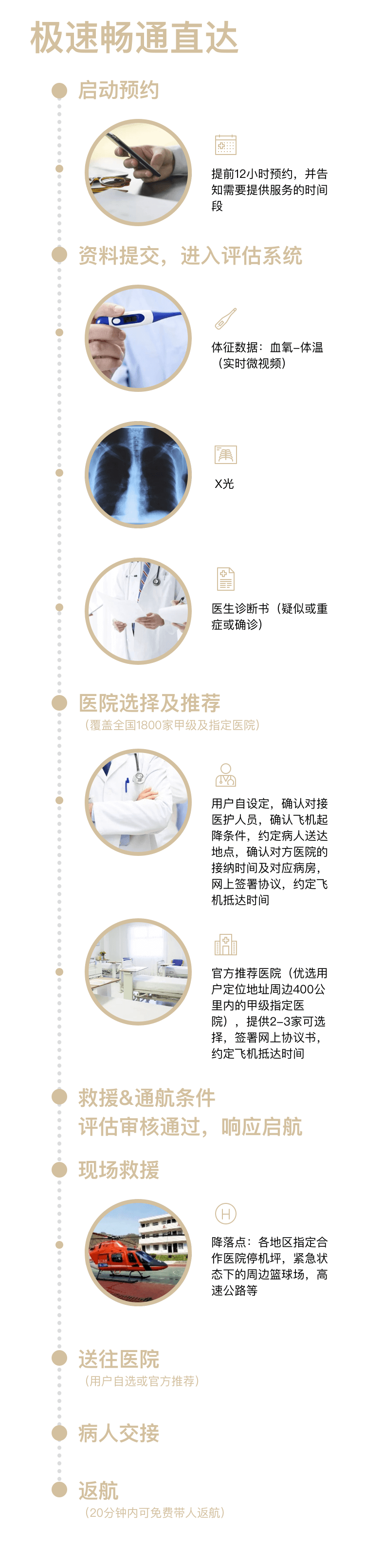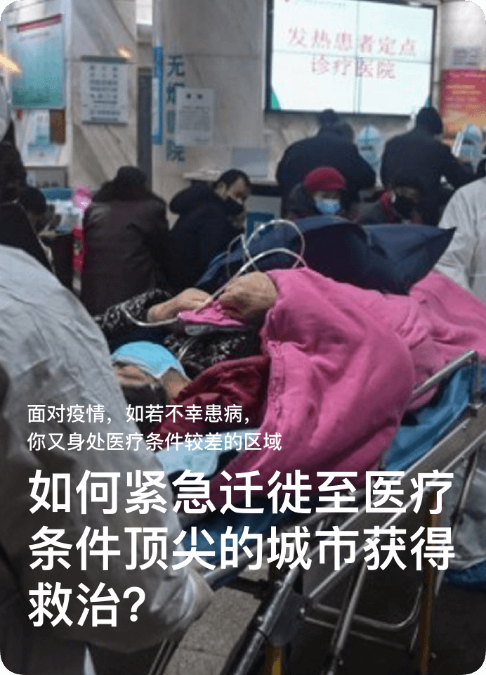 疫情下,若不幸患病,您又身处医疗条件较差的区域,或医院人满为患无法接纳、病床紧缺,无法获得救治,或城市道路、航空、高铁封闭的情况下,我们将根据地理位置远近提供紧急迁徙至医疗条件较好的城市医疗机构的运送病患服务。