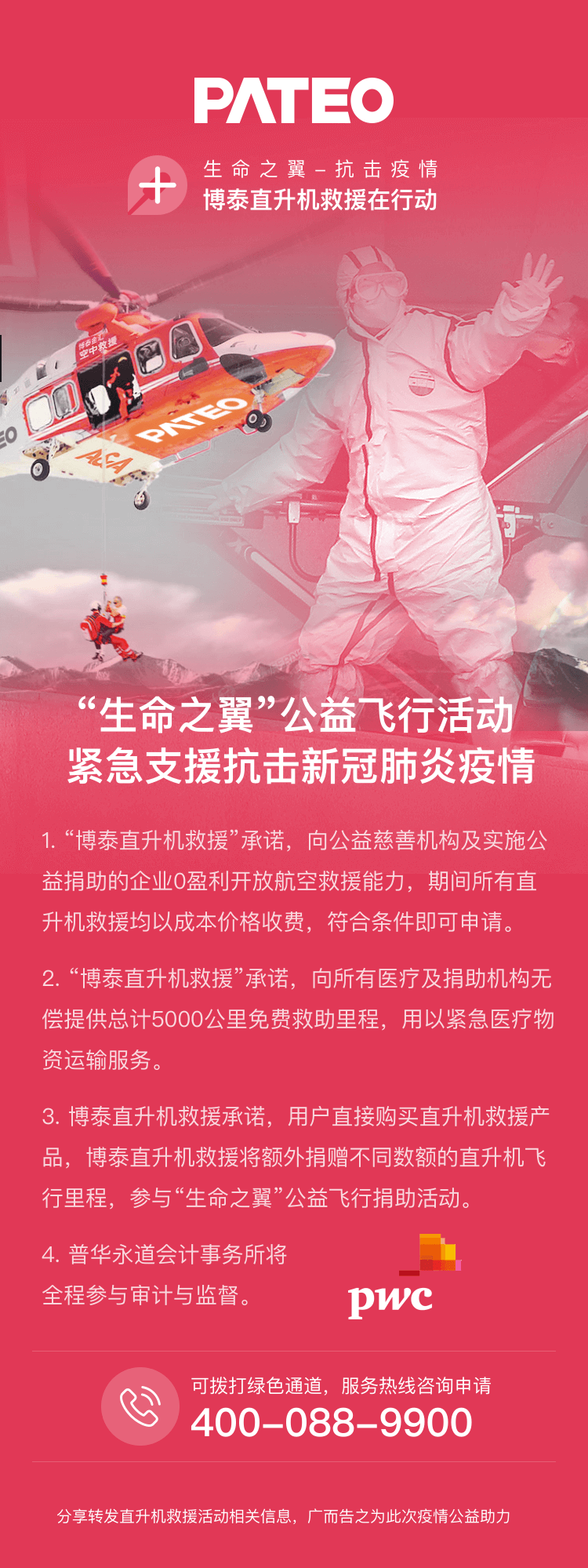 博泰集团旗下的“博泰直升机救援”,是中国最大的紧急救援公司,面对疫情,快速送达顶尖的医院并对接医疗资源的能力才是关键,因为救援生命,分秒必争。我们会用直升机救援病患者到医疗条件好的地方,让患者在医疗资源不够、道路封闭,急需转院的情况下通过直升机快速救援得到及时的救助。疫情当前,再小的概率,落在一家人身上就是百分百,博泰直升机救援,让你不会因为疫情而轻易失去家人,留下惋惜和遗憾。这就是博泰从车联网走向空联网的重要原因,参与到抗击疫情的战役之中,一切为了帮助挽救人民的生命安危。同时,疫情面前人人平等,困难患者有机会得到免费公益飞行就医通道服务。