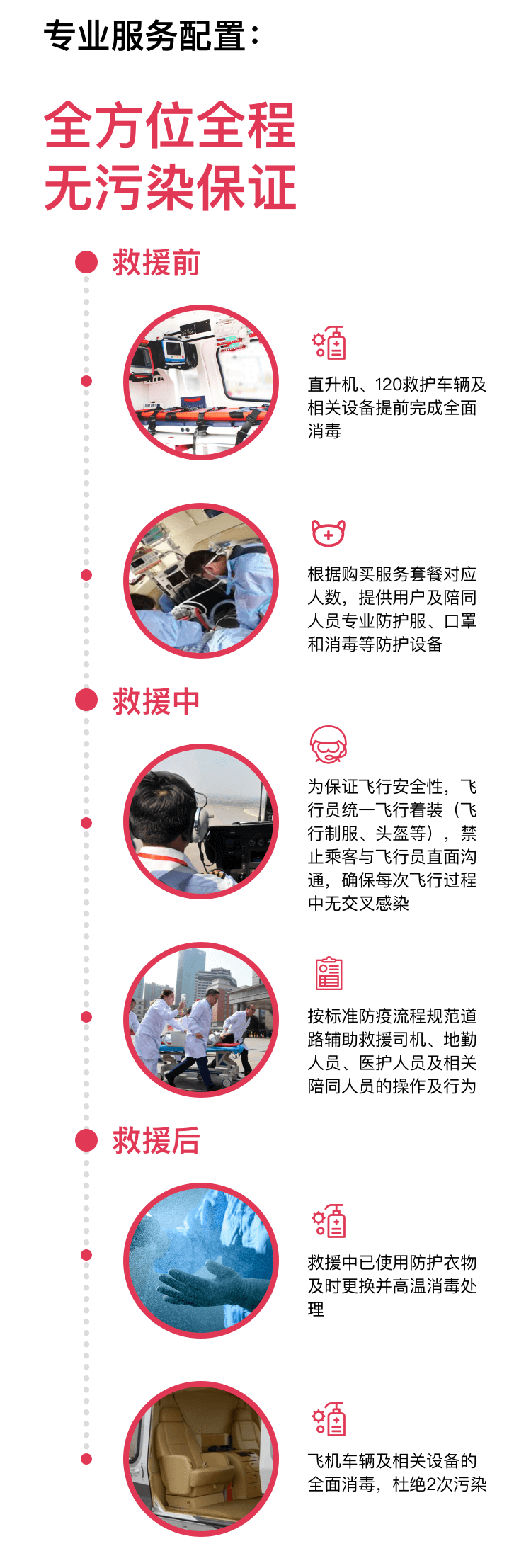 疫情期间,我们将飞机的消毒防控调整为医疗级,每次飞行后都会做医疗级消毒。救援启动后飞行员将着飞行服与口罩,救援人员着防护服与口罩并会给随行人员配置防护服与口罩,确保每次飞行过程不产生任何交叉感染。